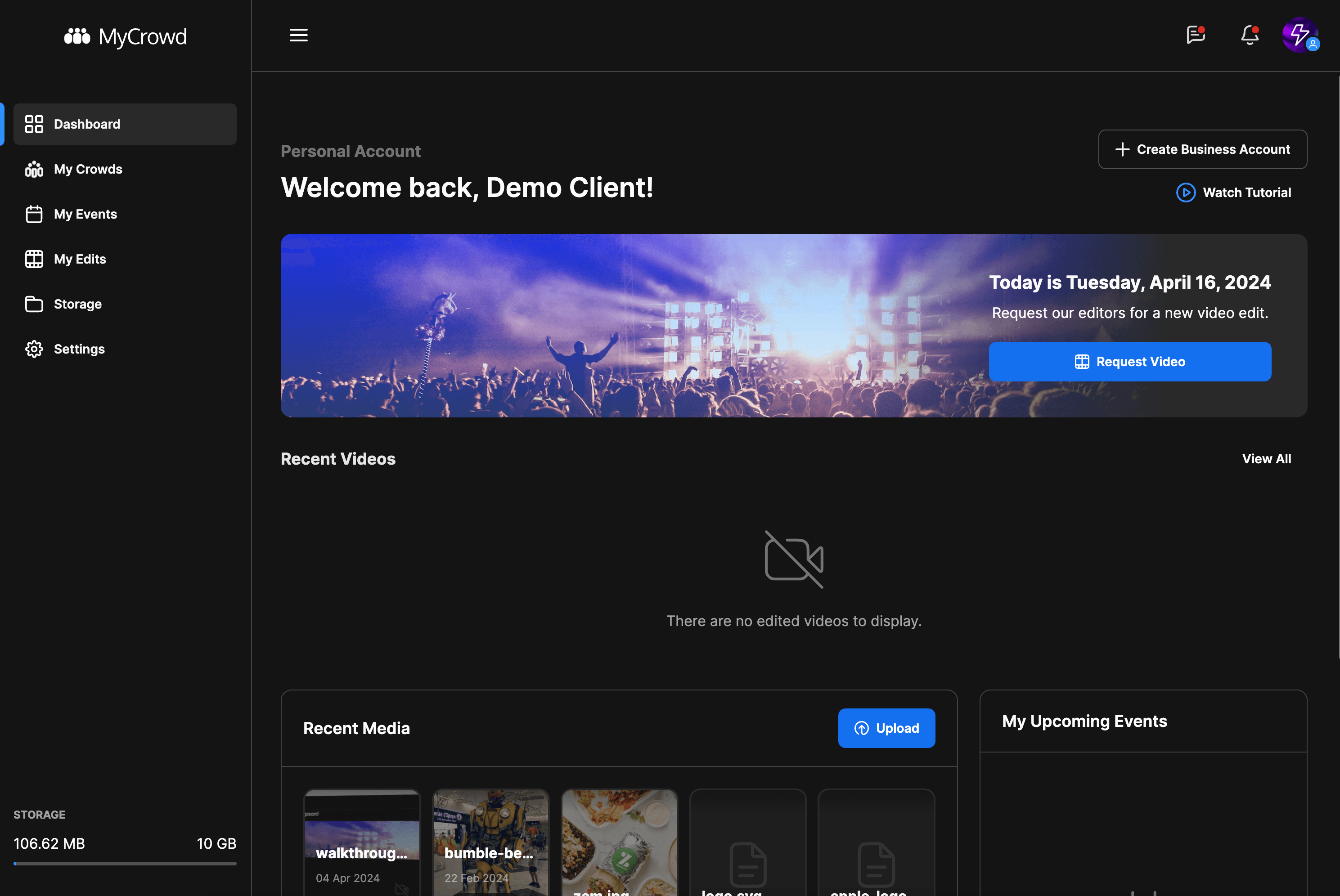 Whether you are a small business wanting to better engage with your customers or you are wanting to capture lasting memories with friends, MyCrowd Connect allows you to effortlessly gather and showcase photos and videos and have the option to request captivating videos created by professional editors.